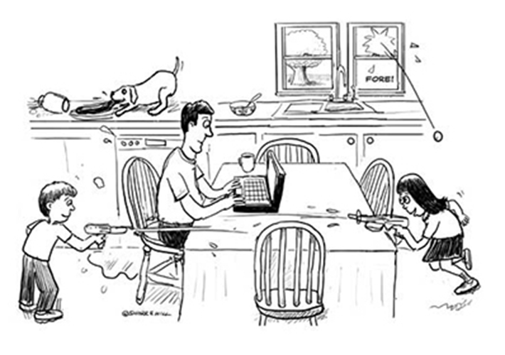 اینجا دو حالت پیش می آید؛ یا شما باید آنها را درک کنید و با صرف انرژی بسیار زیاد سعی کنید که بر روی کارتان تمرکز کنید در حالیکه افراد خانواده دائما رفت و آمد میکنند و انواع و اقسام اصوات را تولید می کنند، حتی دائم با شما صحبت می کنند که در اینصورت بعد از یک مدت از نظر فیزیکی و روحی بسیار فرسوده خواهید شد، یا اینکه باید دائما با افراد خانواده کلنجار بروید و آنها را مجبور کنید که خودشان را با شرایط شما هماهنگ کنند که در اینصورت همواره جنگ اعصاب خواهید داشت. (ابدا فکر نکنید که اتاق جدا داشتن می تواند کمک زیادی به شما نماید).
